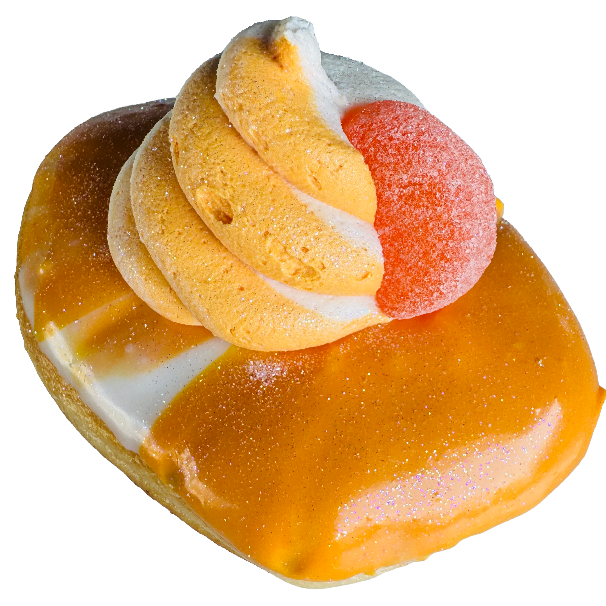 Orange-glazed donut swirled with creamy vanilla-orange icing and finished with a candied orange slice.