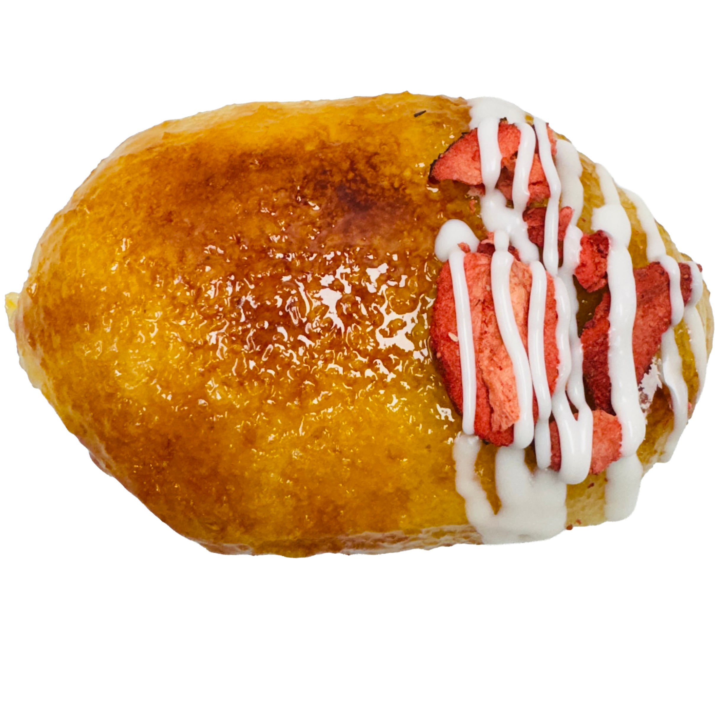 Soft shell filled with silky strawberry cream, finished with a perfectly torched, crackly sugar crust.