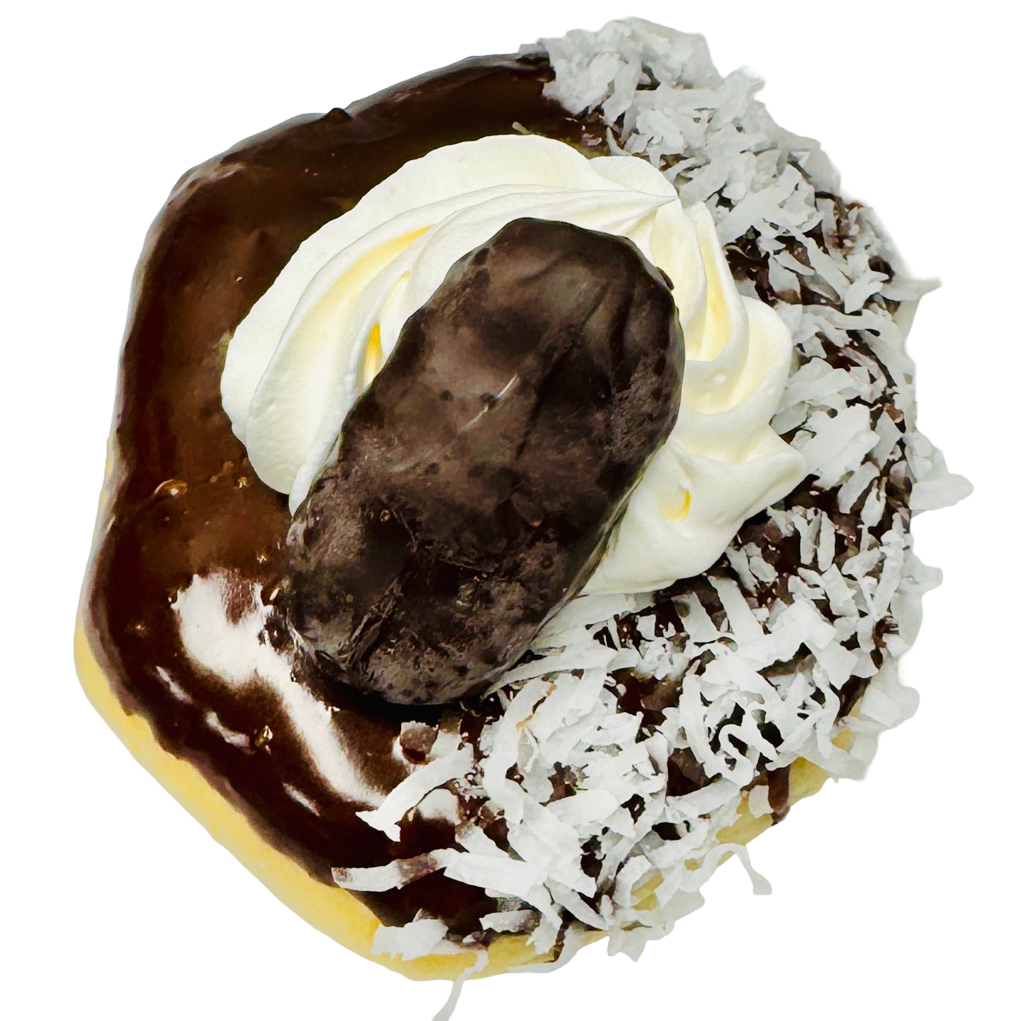 Indulge in a handcrafted donut filled with rich cannoli cream, dipped in luscious chocolate, crowned with a swirl of whipped cream, a sprinkle of chocolate chips, and finished with a full-size, hand-piped cannoli on top.